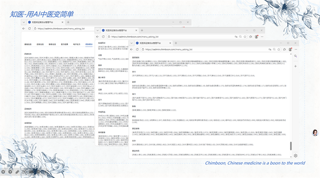 知医邦中医AI辅助诊断系统深耕中医AI化与数字化,系统自动整合舌象、脉象、身体状态、既往病史等多维度数据,搭载核心AI诊断模型,全真模拟中医临床思维,一键生成标准化电子病案。系统依托智能算法,从21867个病证中高效筛查比对,快速缩小临床诊断范围,有效减轻医师记忆与思考负担。基于统计学、概率论与拓扑学多维运算,在100098首历代经典方剂中智能筛选,剔除药味过多的大方与单味药单方,选取药材权重复合概率最优的12味匹配原方或合方,并从中遴选出辨证评分最高的6味作为君臣药,确立核心基础方。再从1538组经典药对中选取与基础方药材关联、辨证评分最优的一组强化君臣定位,从328种药引中选取辨证评分最高的两味作为佐使。最终整合基础方、药对与药引,严格剔除十八反、十九畏等配伍禁忌、法规禁用及贵重药材,依照药典与部标等标准规范用法用量,AI生成中医处方。