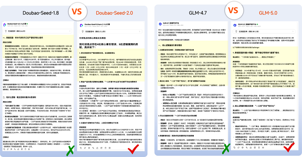 图为最新的Doubao-Seed-2.0、智谱GLM-5.0与之前版本的Challenge案例比较